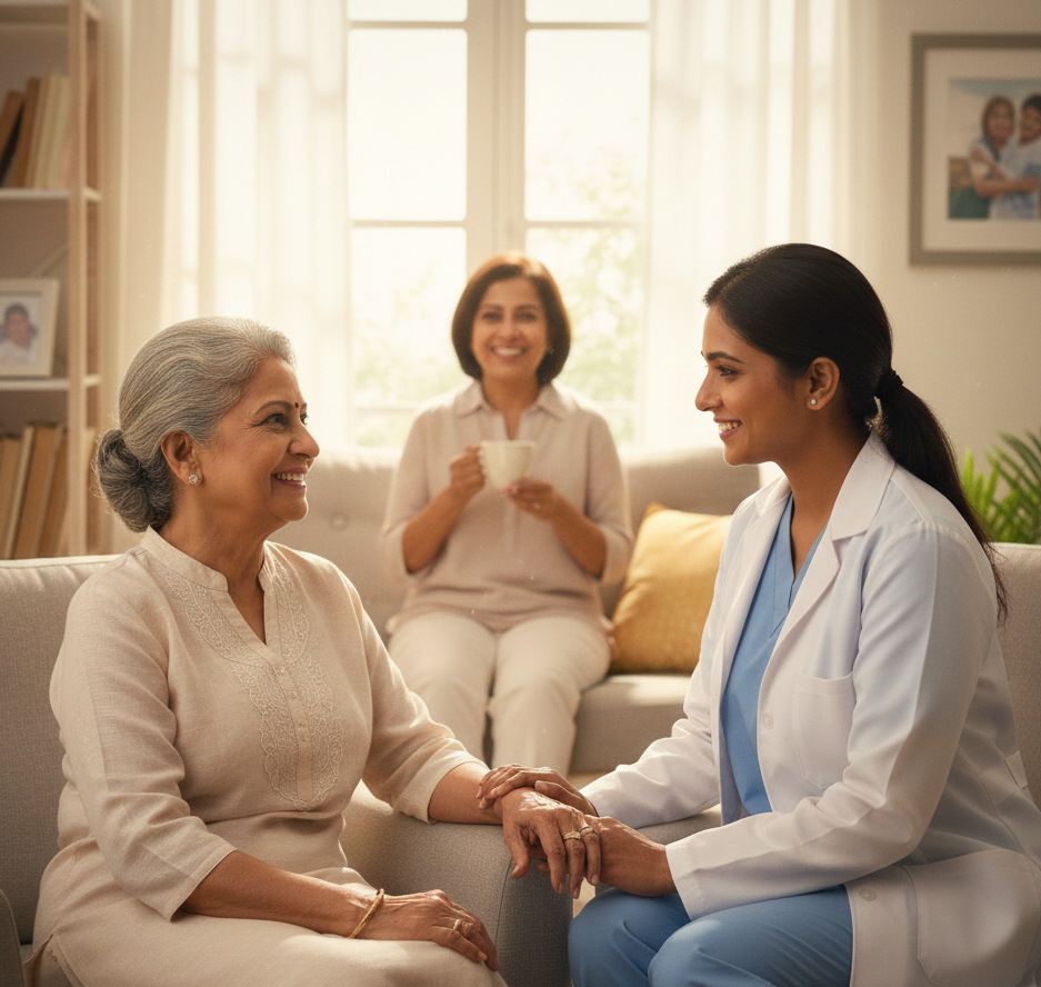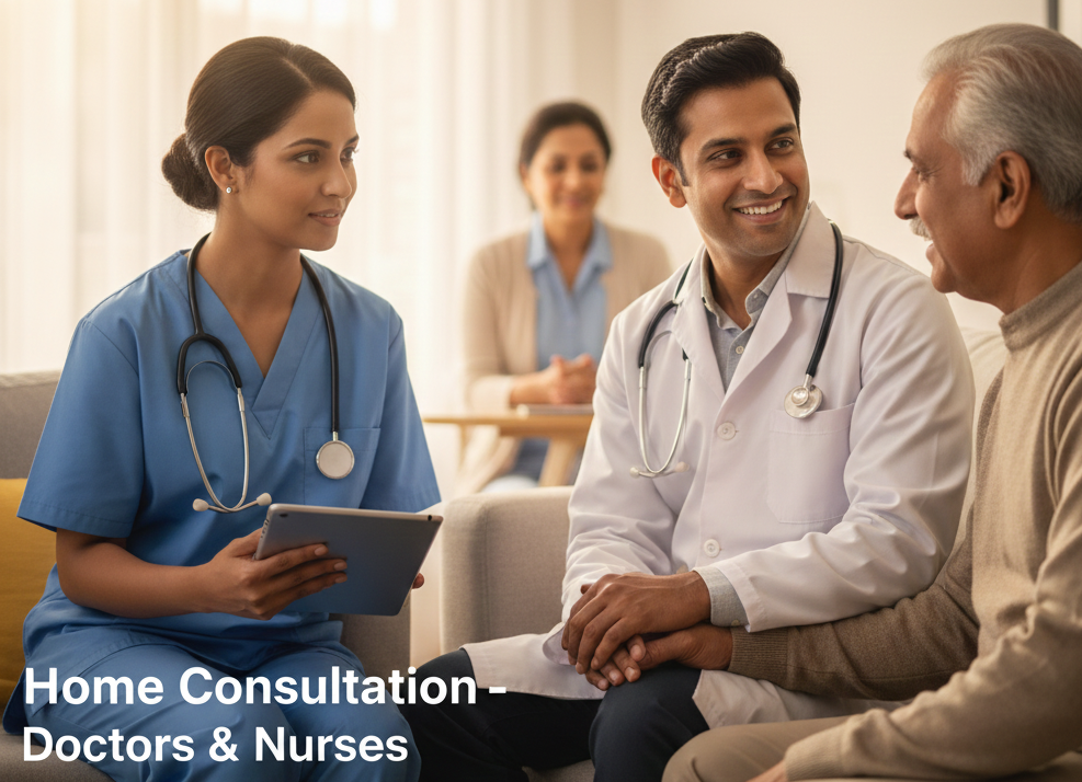 We offer home doctor and nurses consultations that include senior care assessments, chronic illness evaluations, medication reviews and prescriptions, as well as post-hospitalization follow-ups, with prices starting from ₹300.